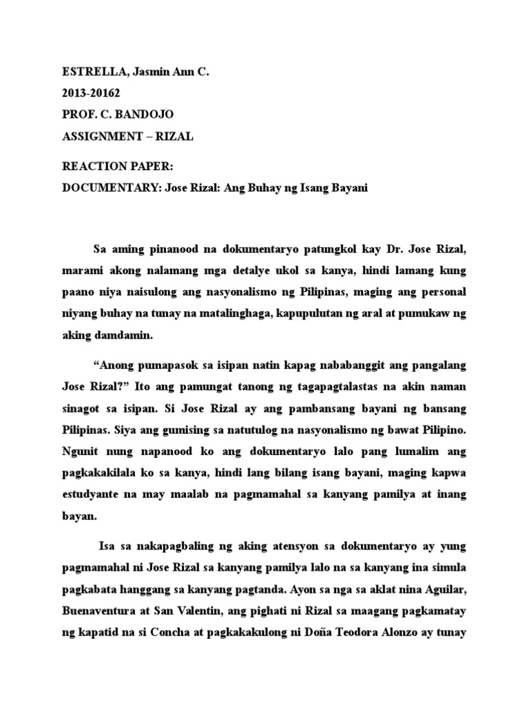 Mula sa mga palabas sa aming Pilipino klase tungkol kay Rizal marami akong bagong nalaman at natuklasan tungkol sa ating mahal na bayani. Reaksyon Sa Talambuhay Ni Rizal Essays and Research Papers. Isa itong lugar kung saan maaari kang makapulot ng mga bagay na di mo pa nalalaman at karamihan dito ay tungkol kay Rizal.