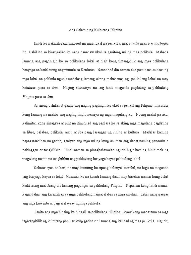 Kultura ng Pilipinas Sagot. Tungkol sa pagkain Pilipinoy Maaaring Kilanlin sa Pamamagitan ng Kanyang Pagkain at isang sanaysay tungkol sa popular na kalyeserye ang Aldub Ang Sinasabi ng Aldub. Ipinakikita sa aklat na ito na sa gitna ng lahat ng nangyayari sa ating mga buhay ang buhay kalikasan at isipan ni Kristo ay nanahanan sa atin Filipos 16 11.