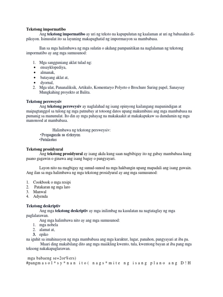 Ito ay may mga uri at isa na dito ang Deskripsyong teknikal o ang paglalarawan ng detalyado. Ang teksto ay anumang bagay na maaaring maging basahin kung ang mga bagay na ito ay isang trabaho ng panitikan isang street sign isang pag-aayos ng mga gusali sa lungsod ng bloke o mga estilo ng pananamit. Kahulugan ng pamagat ng aklat.