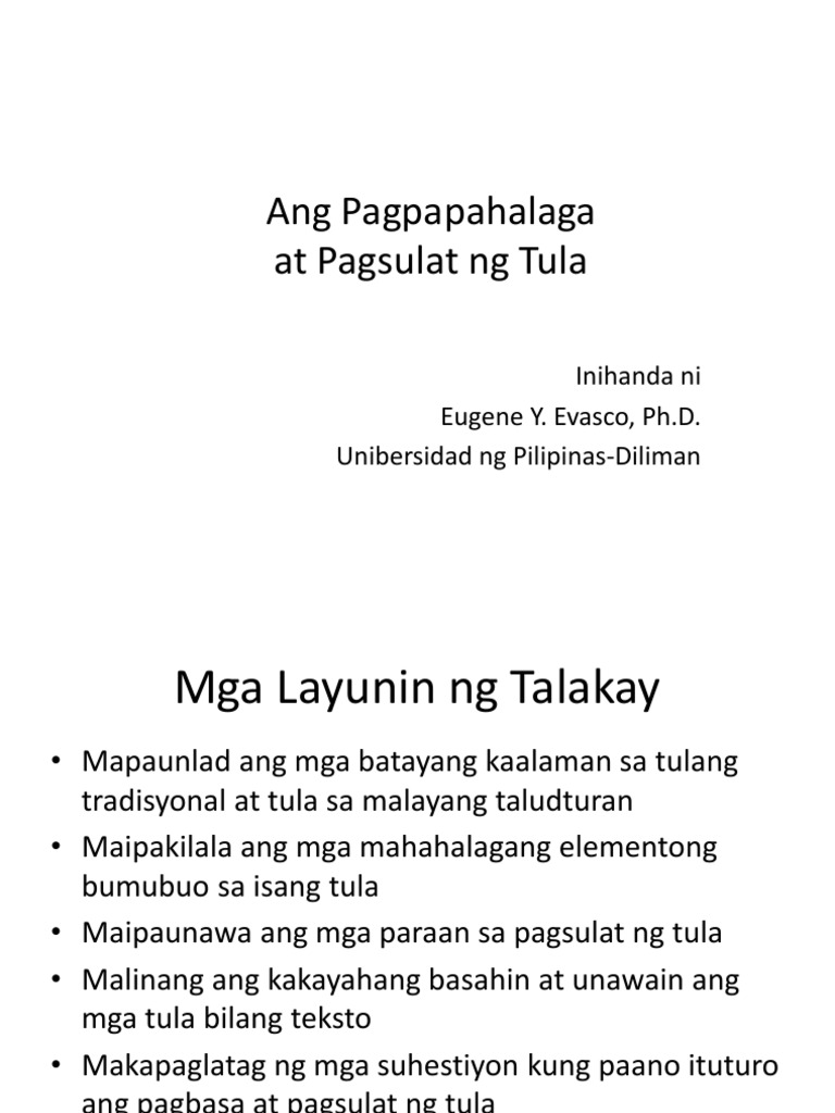 Malinaw na si propeta Samuel ang sumulat ng mga aklat na ito. Mga Piling Akdang Pilipino 1970. Unibersidad ng Pilipinas-Diliman Mga Layunin ng Talakay Mapaunlad ang mga batayang kaalaman sa tulang tradisyonal at tula sa malayang taludturan Maipakilala ang mga mahahalagang elementong bumubuo sa isang tula Maipaunawa ang mga paraan sa pagsulat ng tula Malinang ang kakayahang.