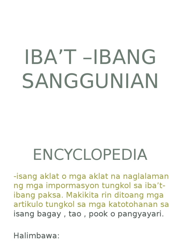 Sangguniang aklat halimbawa. MARIA KRIZZA MEIZ DS. Artikulo mula sa isang librong referensya. Heto ang isa sa pinaka malawak at epektibong halimbawa ng Pangkalahatang sanggunian.