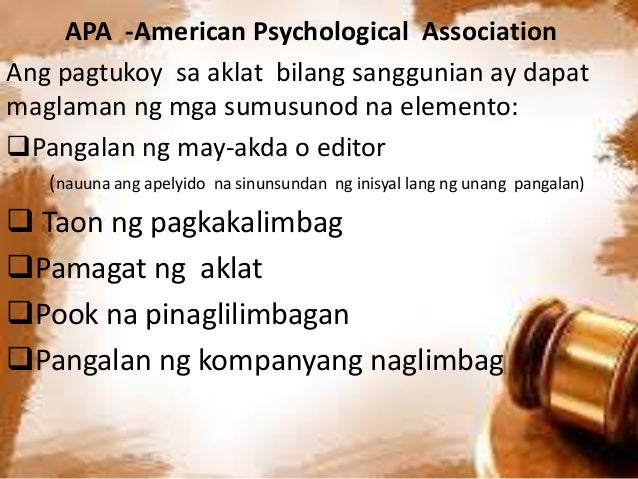 Simulan sa apelyido ng awtor sundan ng kuwit at inisyal ng awtor o buong pangalan kung abeylabol ang datos na iyon at tuldukan. Talaan ng ibat ibang sanggunian katulad ng mga aklat artiku peryodiko magasin at iba paa. Ito ay talaan ng ibat ibang sanggunian katulad ng mga aklat artikulo report peryodiko magasin at iba pang nalathalang materyal maging ang internet.